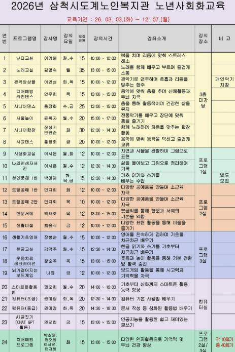 [메이저뉴스]삼척시도계노인복지관은 2026년도 노년사회화교육 프로그램 개강을 앞두고 수강생 모집을 시작했다.