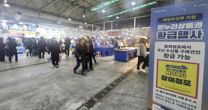 이번 행사는 수산물 소비촉진과 도매시장 활성화를 위해 해양수산부 지원으로 지난 추석 명절에 이어 두 번째로 개최됐다. 수산동 26개 점포가 참여한 이번 행사는 국내산 수산물 구매 시, 구매 금액의 최대 30%(1인 2만원 한도 내)를 온누리상품권으로 환급하는 혜택을 선보였다.