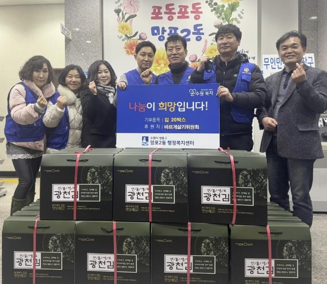 [메이저뉴스]영통구 망포2동 행정복지센터는 지난 6일 망포2동 바르게살기위원회가 관내 저소득 가정을 지원하기 위해 김 20박스를 기탁했다고 밝혔다.