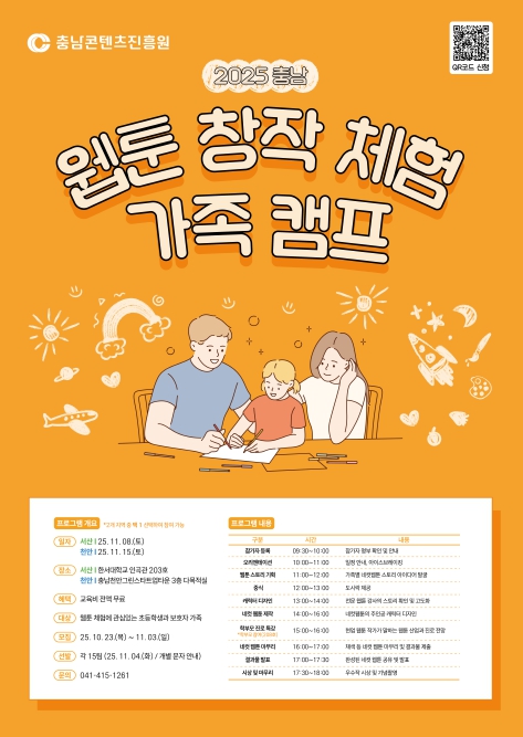 [메이저뉴스]충남콘텐츠진흥원은 충남의 웹툰 문화 활성화와 가족이 함께하는 창의적 웹툰 문화체험을 제공하기 위해 ‘2025 충남 웹툰 창작체험 가족 캠프’를 개최한다.