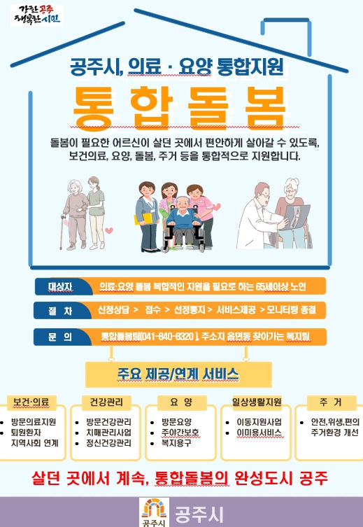 통합돌봄 사업은 두 가지 이상 복합적인 돌봄이 필요한 노인과 65세 미만 지체·뇌병변 심한 장애인을 대상으로 보건의료, 요양, 돌봄 등 서비스를 통합적으로 연계하고 지원해 공주시에서 안정적인 생활을 유지할 수 있도록 돕는 사업이다.