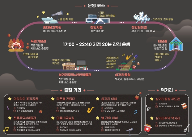 별빛 한바퀴 시즌2는 독립기념관 단풍나무숲길 등 천안의 다양한 관광자원과 연계한 야간관광 코스로 운영된다.