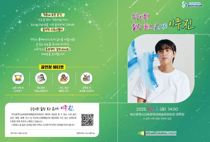 [메이저뉴스]부산광역시교육청학생예술문화회관(관장 박은혜)은 오는 5일 오후 2시 학생예술문화회관 대극장에서 수능을 마친 고3 학생 700여 명을 대상으로 가수 이무진과 함께하는 ‘수능 이후! 힐링 토크 콘서트’를 개최한다.