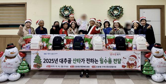 | ▲ 수원시 장안구 조원1동 지역사회보장협의체, '산타가 전하는 책가방 세트' 전달 |
