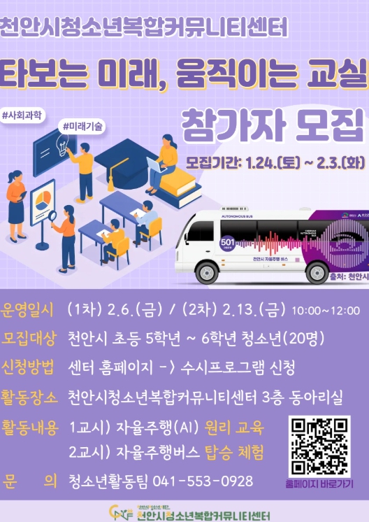 [메이저뉴스] (재)천안시청소년재단 천안시청소년복합커뮤니티센터가 겨울방학을 맞아 자율주행버스를 직접 타보고 미래 기술을 배우는 ‘타보는 미래, 움직이는 교실’ 참가자를 모집한다고 26일 밝혔다.