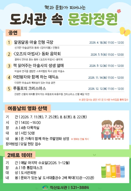 오는 7월과 8월에는 온 가족이 함께 즐길 수 있는 ‘여름날의 영화 산책’을, 매주 마지막주 수요일 문화가 있는 날에는 20권의 책을 대출할 수 있는 ‘두 배로 데이!’를 운영한다.