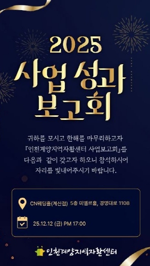 [메이저뉴스]인천계양지역자활센터(센터장 한경주)는 2025년 한 해 동안 추진한 자활사업의 성과를 공유하고 참여주민을 격려하기 위해 ‘2025년 사업성과 보고회’를 오는 12월 12일 오후 5시 CN웨딩홀 계산점에서 개최한다고 밝혔다.