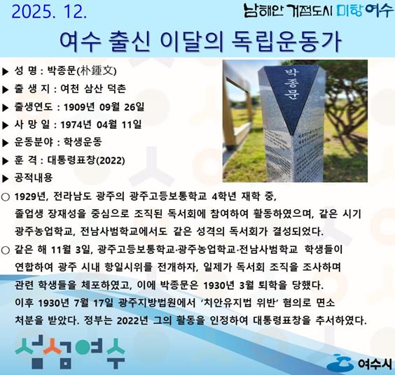 [메이저뉴스]여수시는 2025년 12월의 독립운동가로 전라남도 여천 삼산 덕촌 출신의 ‘박종문(朴鍾文)’ 선생을 선정했다.