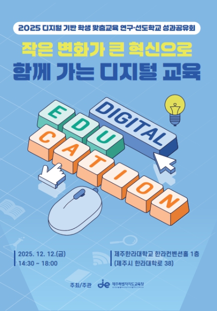 [메이저뉴스]제주특별자치도교육청은 12일 제주한라대학 한라컨벤션홀에서 ‘2025 디지털 기반 학생 맞춤교육 연구·선도학교 운영결과 공유회’를 개최한다.