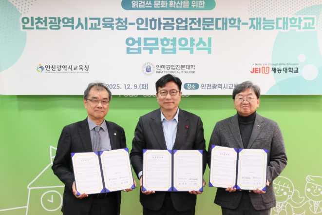 [메이저뉴스]인천광역시교육청은 9일 인하공업전문대학, 재능대학교와 읽걷쓰 문화 확산을 위한 업무 협약을 체결했다.