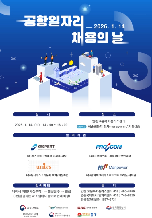 [메이저뉴스]인천시 중구는 오는 14일 구월동 소재 인천고용복지플러스센터 지하 2층 채용행사장(남동구 문화로 131)에서 ‘2026년도 제1회 공항일자리 채용의 날’ 행사를 개최한다.