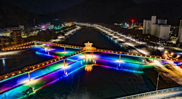 괴산읍 도심을 흐르는 성황천과 동진천 일대는 최근 강추위로 수면이 꽁꽁 얼어붙으면서, 두 하천을 연결하는 에코브릿지 하부에 설치된 다채로운 색감의 경관조명이 얼음 위로 선명하게 비쳐 고요한 겨울밤 속 색다른 장관을 만들어내고 있다.