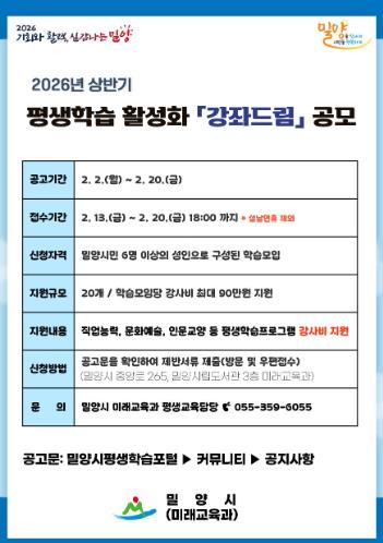 신청 기간은 오는 2월 13일부터 2월 20일까지이며 신청 방법과 세부 사항은 밀양시평생학습포털 공지사항을 통해 확인할 수 있다.
