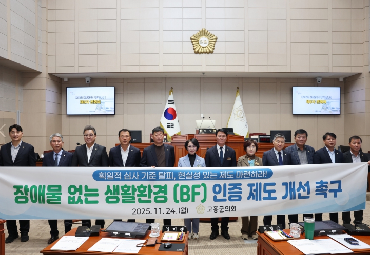 이에 고흥군의회는 건의문에 ▲복잡한 인증 절차 간소화 ▲명확한 심사 기준 마련 ▲BF 인증 기관 지정 확대 등의 건의사항을 명시하여 당초 목적에서 벗어나 오히려 공공건물 신축 과정의 걸림돌이 되고 있어 시민 불편을 초래하고 있는 BF 인증 제도의 조속한 개선을 촉구했다.