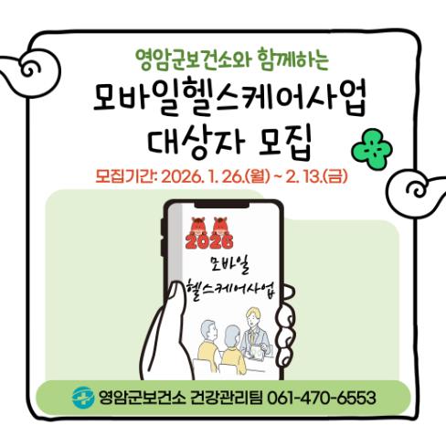 [메이저뉴스]영암군보건소가 1/26~2/13일 ‘2026년 모바일 헬스케어사업’ 참여자 50명을 선착순 모집한다.