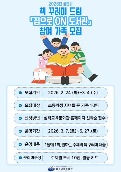 [메이저뉴스] 삼척교육문화관은 3월부터 6월까지 가족 단위 독서 문화를 장려하기 위하여 초등학생 자녀를 둔 가족을 대상으로 책 꾸러미 드림 ‘집으로 온(ON) 도서관’을 운영한다.
