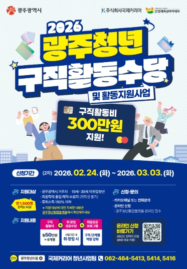 [메이저뉴스]광주광역시는 미취업 청년의 안정적인 취업 준비를 지원하기 위해 ‘2026년 광주 청년 구직활동수당 지원’ 2차 참여자 1147명을 오는 3월3일까지 모집한다.