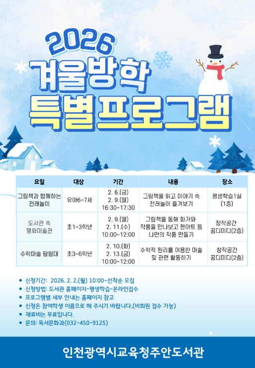 [메이저뉴스]인천광역시교육청주안도서관은 관내 유·초등학생에게 다양한 평생학습 기회를 제공하기 위해 2월 6일부터 13일까지 ‘겨울방학 특별프로그램’을 운영한다.