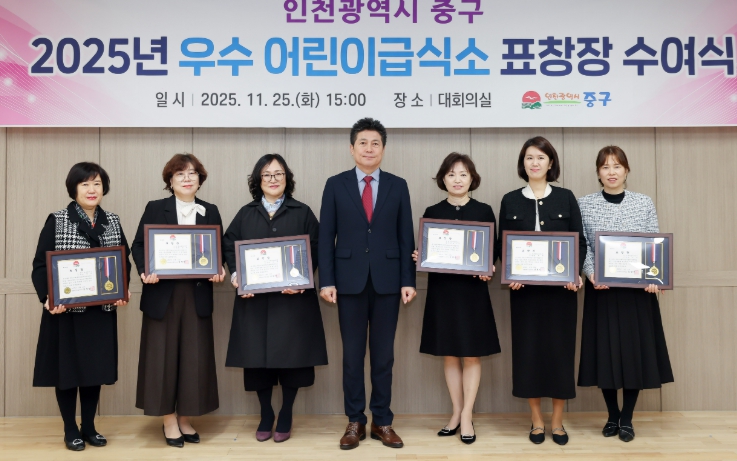 [메이저뉴스]인천시 중구는 올 한 해 어린이 급식환경 개선에 앞장선 모범 어린이급식소에 대한 노고를 격려하고자 지난 25일 중구 제2청 회의실에서 ‘2025년 우수 어린이급식소 표창장 수여식’을 개최했다.