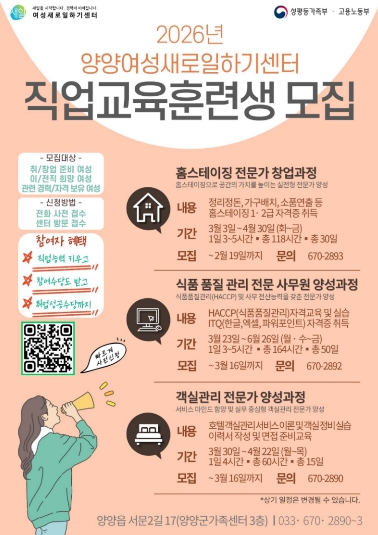 [메이저뉴스]양양여성새로일하기센터는 취·창업을 희망하는 여성을 대상으로 2026년도 직업교육훈련생 50명을 모집한다.