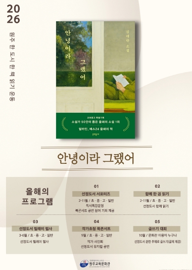 특히 올해는 ‘원주 한 도시 한 책 읽기’ 사업 최초로 선정 도서 서포터즈를 새롭게 운영한다. 3월부터 10월까지 활동하는 선정 도서 서포터즈는 독서 캠페인과 행사 운영 지원 등 서포터즈 활동을 수행하는 한편, 북콘서트 참여와 특강을 통해 독서 및 문화 활동에 대한 이해를 높이는 역할을 맡는다. 이를 통해 시민이 단순한 프로그램 참여자를 넘어 독서 문화 확산의 주체로 성장할 수 있는 기반을 마련할 계획이다.
