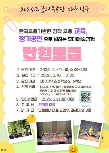 남구청소년창작센터 관계자는 “꿈의 무용단은 단순한 무용 교육이 아니라, 아이들이 스스로를 발견하고 함께 성장하는 과정”이라며 “지역 아동들이 예술을 통해 자신의 가능성을 펼칠 수 있도록 적극 지원하겠다.”라고 밝혔다.