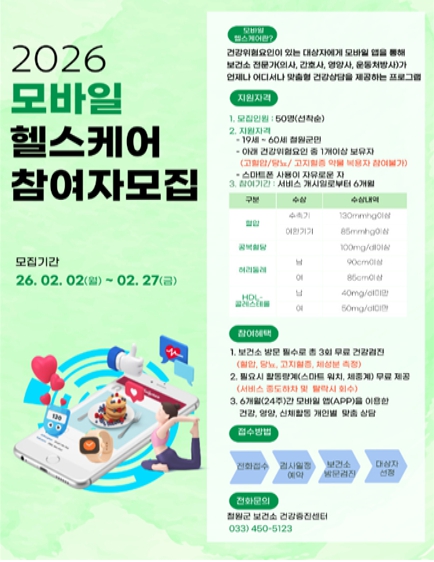 [메이저뉴스]철원군보건소는 군민의 건강증진과 만성질환 예방을 위해 스마트폰 앱을 활용한 맞춤형 건강관리 서비스인 ‘모바일 헬스케어 사업’ 참여자 50명을 선착순으로 모집한다.
