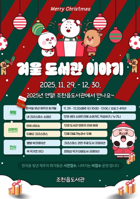 [메이저뉴스]제주시 조천읍도서관은 지역 주민에게 따뜻한 겨울의 추억을 선사하기 위해 11월 29일부터 12월 30일까지 송년 특별 프로그램 ‘겨울 도서관 이야기’를 운영한다.