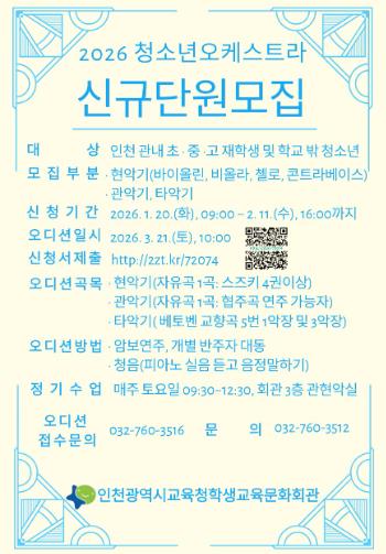 [메이저뉴스]인천광역시교육청학생교육문화회관은 3월 21일 ‘2026학년도 청소년오케스트라 단원 모집 오디션’을 실시한다.