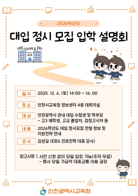 [메이저뉴스]인천광역시교육감은 12월 6일 관내 대입 수험생과 학부모를 대상으로 2026학년도 대입 정시모집 입학설명회를 실시한다.