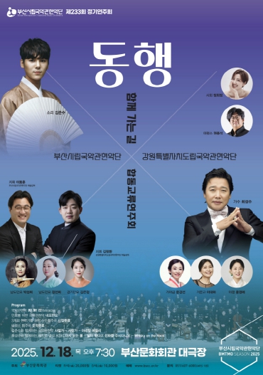 [메이저뉴스]부산시립국악관현악단(예술감독 이동훈)의 제233회 정기연주회가 다가오는 12월 18 오후 7시 30분, 부산문화회관 대극장에서 강원특별자치도립국악관현악단 합동교류연주회가 '함께 가는 길, 동행'이라는 부제로 개최된다.