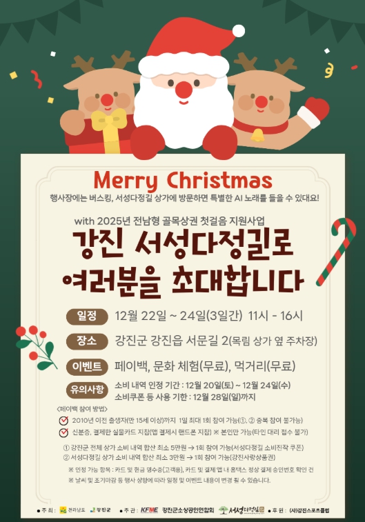 [메이저뉴스]강진군이 오는 22일부터 24일까지 3일간 서성다정길 골목형상점가 구역 일대에서 연말 분위기를 가득 담은 크리스마스 특별행사를 개최한다.