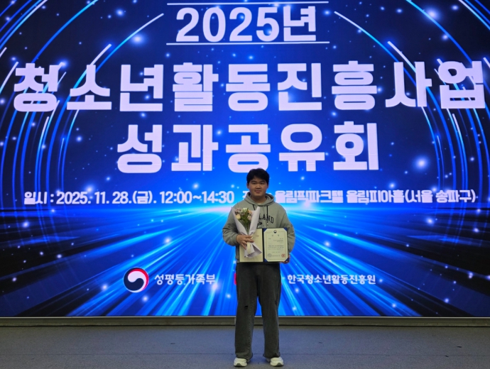 [메이저뉴스]순천시는 지난 28일 서울특별시 올림픽파크텔에서 열린 2025년 청소년활동진흥사업 통합 성과공유회에서 순천시청소년문화의집 방과후아카데미를 수료한 왕윤성 학생이 『2025년 청소년방과후아카데미 활동수기 공모전』 일반부문에서 성평등가족부 장관상(대상)을 수상하는 쾌거를 이뤘다고 밝혔다.