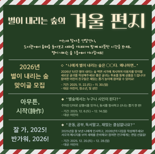 22일부터 30일까지 진행되는 ‘2026년 별이 내리는 숲 맞이글 모집’에서는 내년 한 해 도서관 내부 벽면 서가에 게시할 글귀를 공모하며, 이용자 선호도 투표로 우수작을 선정해 소정의 상품을 증정하고 어린이는 뽑기 놀이도 즐길 수 있다.