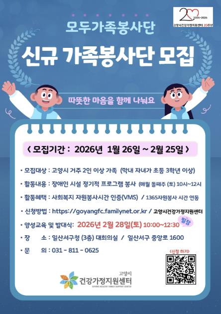 [메이저뉴스]고양특례시 건강가정지원센터에서는 오는 2월 25일까지 2026년 ‘가족봉사단’참여자를 모집한다.