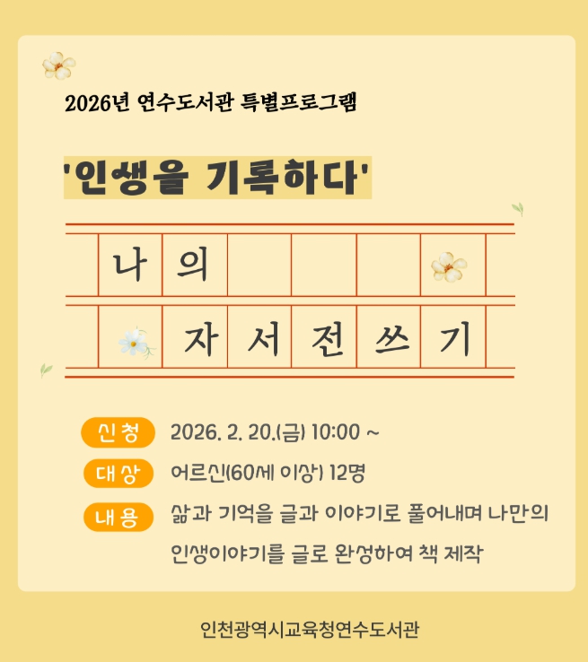 [메이저뉴스]인천광역시교육청연수도서관은 어르신의 삶을 기록하고 소중한 인생 이야기를 한 권의 책으로 엮는 ‘어르신 자서전 쓰기’ 프로그램 참여자를 20일부터 모집한다.