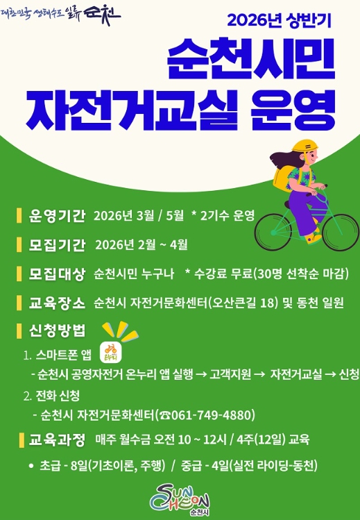 [메이저뉴스]순천시는 자전거 이용 활성화와 안전한 교통문화 정착을 위해 2026년 상반기 시민 자전거교실 수강생을 모집한다고 밝혔다.