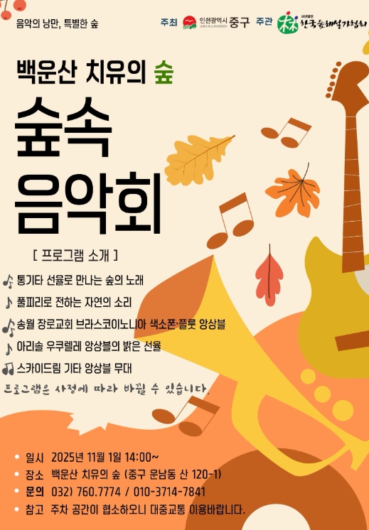 [메이저뉴스] 인천시 중구는 문화와 나들이의 계절 가을을 맞이해 오는 11월 1일 오후 2시부터 백운산 치유의 숲(운남동 산120-1)에서 ‘백운산 치유의 숲 숲속음악회’를 개최한다.