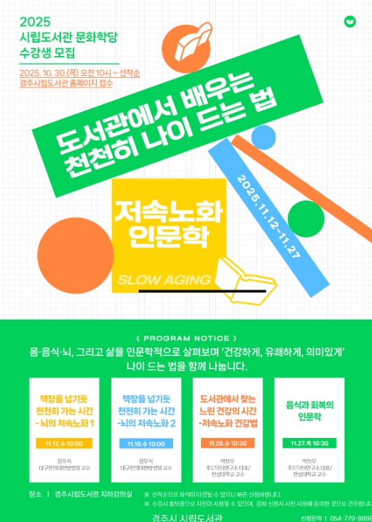 참여 신청은 10월 30일 오전 10시부터 경주시립도서관 홈페이지에서 가능하며, 자세한 내용은 시립도서관 사서팀으로 문의하면 된다.