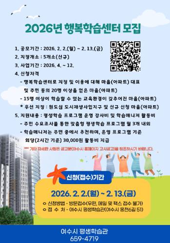 [메이저뉴스]여수시는 주민 생활권 중심의 평생학습 기회를 확대하기 위해 '2026년 읍·면·동 행복학습센터' 신규 지정 사업에 참여할 마을(아파트)을 모집한다고 밝혔다.