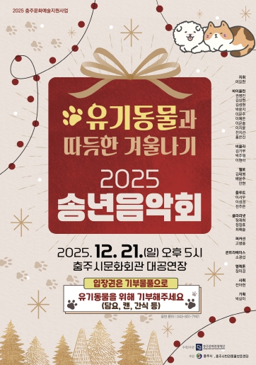 [메이저뉴스] 충주문화관광재단은 오는 12월 21일 오후 5시, 충주시문화회관 대공연장에서 '유기동물과 따듯한 겨울나기 2025 송년음악회'를 개최한다.