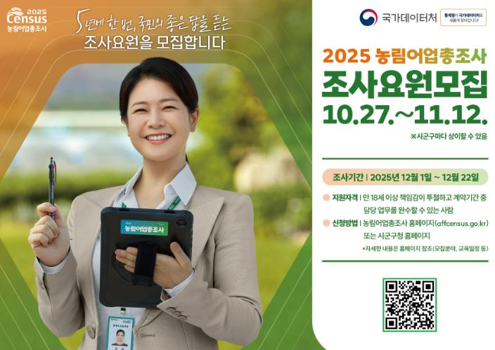 [메이저뉴스]남원시는 ‘2025년 농림어업총조사’의 성공적 추진을 위해 조사요원 총 111명 (조사관리요원 15명, 조사원 96명)을 오는 11월 12일까지 모집한다.