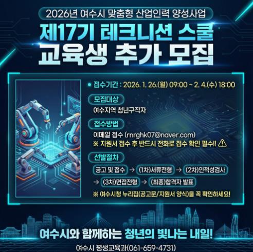 [메이저뉴스]여수시가 지역 산업 수요에 맞는 전문 인력을 양성하기 위해 추진하는 ‘2026년 여수시 맞춤형 산업인력 양성사업’의 일환인 '테크니션 스쿨 제17기' 교육생을 추가 모집한다고 밝혔다.