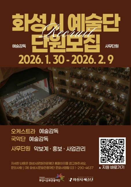[메이저뉴스](재)화성시문화관광재단은 2026년 ‘화성시 예술단’을 이끌어갈 예술감독과 사무단원을 모집한다.