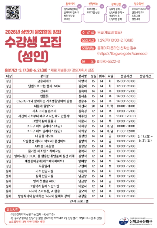 수강생 모집 기간은 1월 29일부터 2월 10일까지이며, 삼척교육문화관 누리집 을 통해 선착순 접수한다.