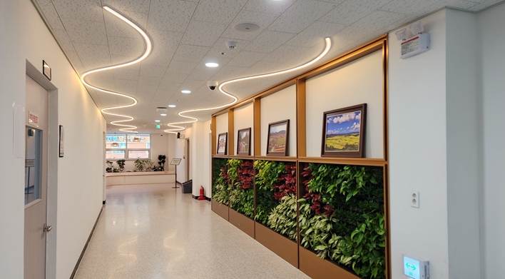 [메이저뉴스]철원군은 7월에 조성한 와수복합어울림센터 4층 작은영화관 실내정원의 큰 호응에 힘입어, 2층 프로그램실 간 복도에 유휴공간을 활용하여 추가로 수직 정원 조성을 완료했다고 28일 밝혔다.