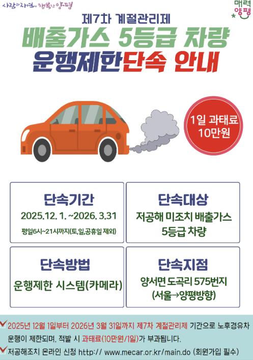 [메이저뉴스]양평군(은 오는 12월 1일부터 2026년 3월 31일까지 제7차 미세먼지 계절 관리제 시행에 따라 배출가스 5등급 차량에 대한 운행 제한 단속을 시행한다고 밝혔다.