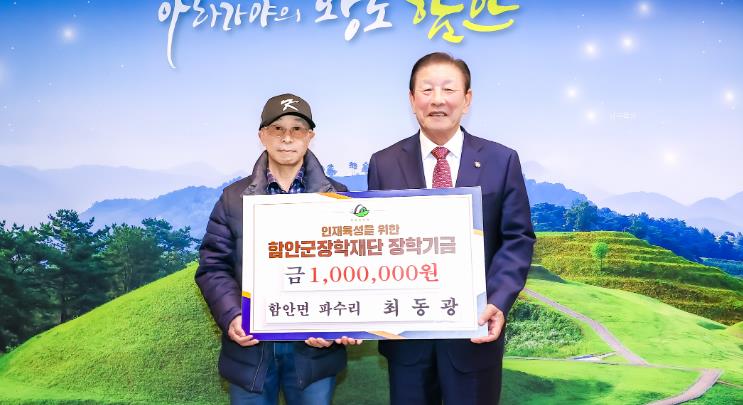 [메이저뉴스] 함안군 함안면 파수리에 거주하는 최동광 씨가 지난 25일 함안군청을 방문해 지역 인재 육성을 위해 장학기금 100만 원을 함안군장학재단에 기탁했다.