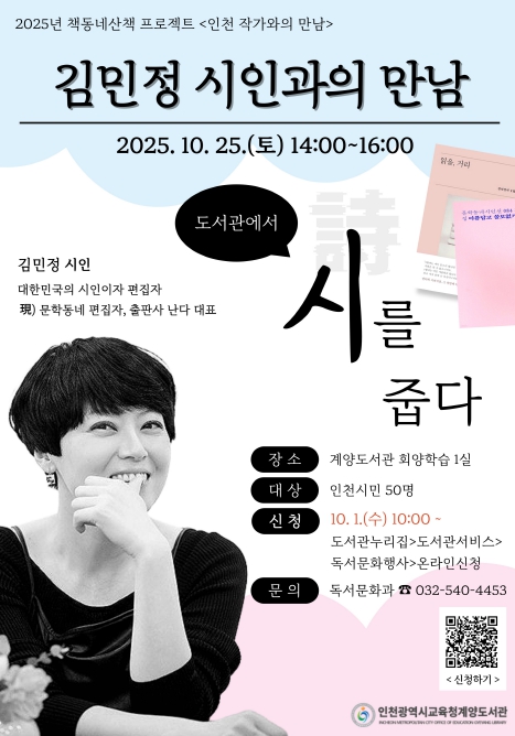 [메이저뉴스]인천광역시교육청계양도서관은 10월 25일 오후 2시 ‘책동네산책 프로젝트’의 일환으로 ‘김민정 시인과의 만남’을 개최한다.
