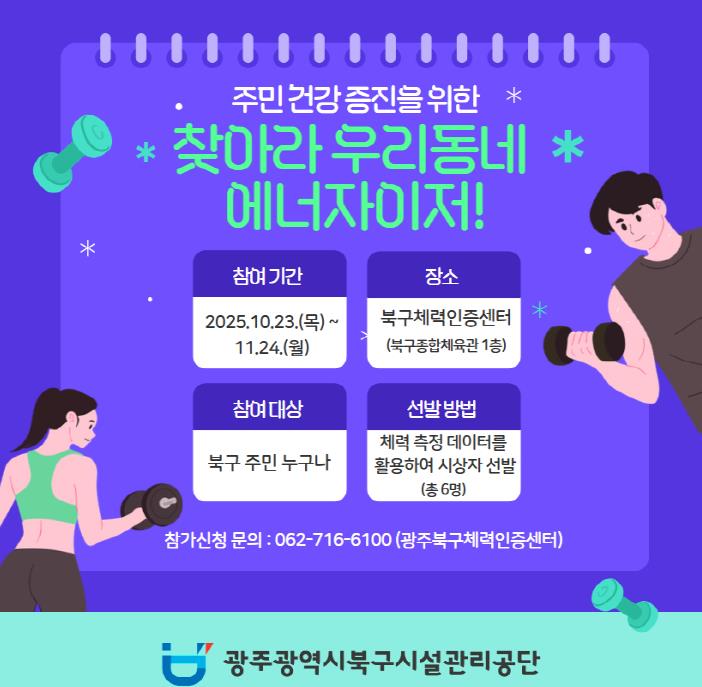 [메이저뉴스]광주광역시북구시설관리공단은 지역 주민들의 체력 증진과 건강한 생활 습관 형성을 위해 ‘찾아라 우리동네 에너자이저!’ 2기 선발대회를 개최한다고 밝혔다.